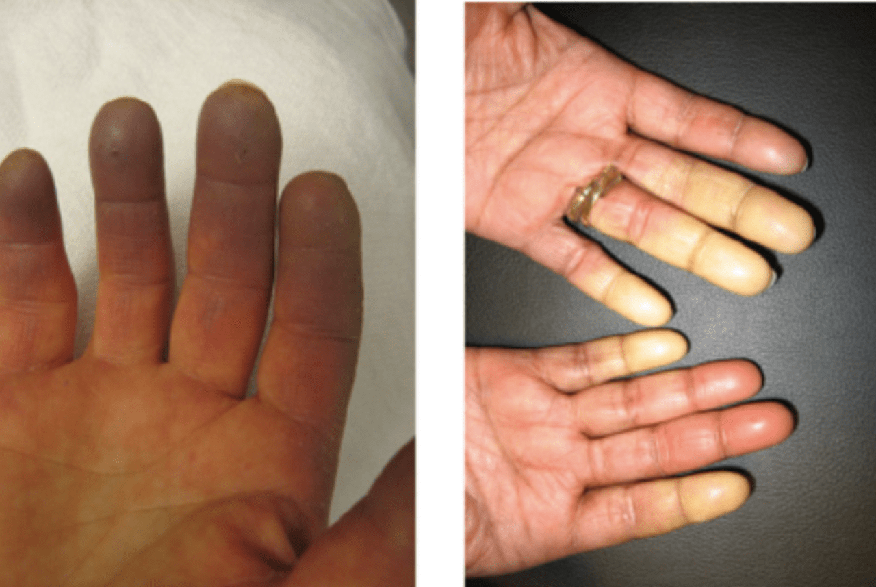 Các ngón có màu trở lại đỏ ,dần dần xanh tím, có khi thành đen, cũng  lan lên vùng gốc chi. ấn tay vào có vết mất mầu, khi thả ra thấy lâu mới  trở lại bình thường được. Đầu chi lạnh, cảm giác buốt,đau tăng lên hoặc đau dữ dội. Nếu dơ cao tay hoặc ngâm nư­ớc ấm làm giảm bớt thâm tím, lâu ngày các ngón tay trở thành dùi trống. Bệnh phát triển thành từng đợt, sau mỗi đợt cơn đau giảm bớt đi,thâm tím đầu chi  trong một thời gian rồi  cũng giảm , bị lạnh đột ngột bệnh lại tái phát.­